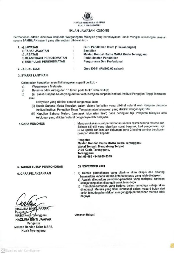 Terkini Iklan Jawatan Kosong Guru Sambillan ~ Maktab Rendah Sains MARA (MRSM) Kuala Terengganu
