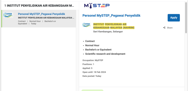 Permohonan jawatan ini boleh dibuat melalui Portal MyFutureJobs. Sila ke Portal MyFutureJobs dan Masukkan Kata Carian yang ingin dicari “INSTITUT PENYELIDIKAN AIR KEBANGSAAN MALAYSIA (NAHRIM)” di bahagian carian untuk memohon jawatan yang diiklankan.