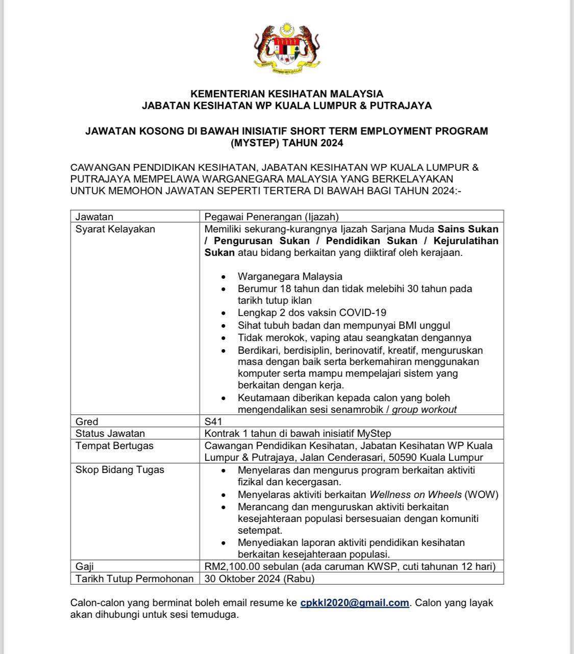 Terkini Iklan Jawatan Kosong Jabatan Kesihatan WP Kuala Lumpur & Putrajaya Like serta Ikut Facebook Kami, follow Chanel WhatsApp Jawatan Kosong & Telegram Portal SPA9 untuk capaian pantas kekosongan jawatan daripada kami sekarang.