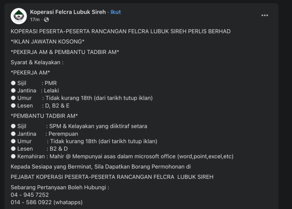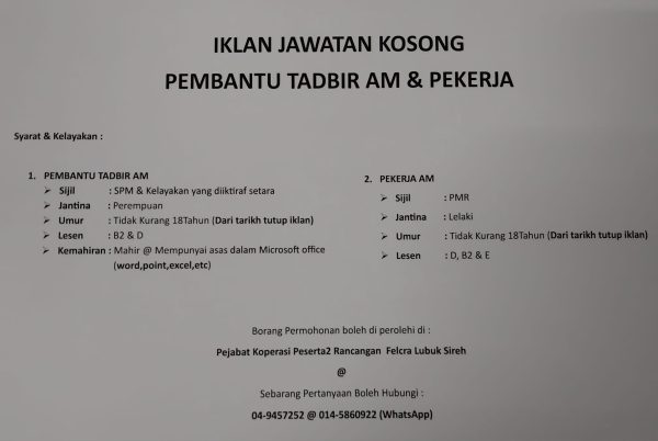 Terkini Iklan Jawatan Kosong Koperasi Felcra Lubuk Sireh Like serta Ikut Facebook Kami, follow Chanel WhatsApp Jawatan Kosong & Telegram Portal SPA9 untuk capaian pantas kekosongan jawatan daripada kami sekarang. Klik Jawatan Disini