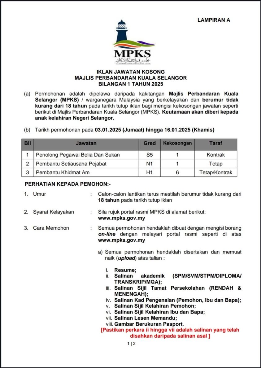 Terkini Iklan Jawatan Kosong Majlis Perbandaran Kuala Selangor (MPKS) Klik Iklan Jawatan Like serta Ikut Facebook Kami, follow Chanel WhatsApp Jawatan Kosong & Telegram Portal SPA9 untuk capaian pantas kekosongan jawatan daripada kami sekarang.