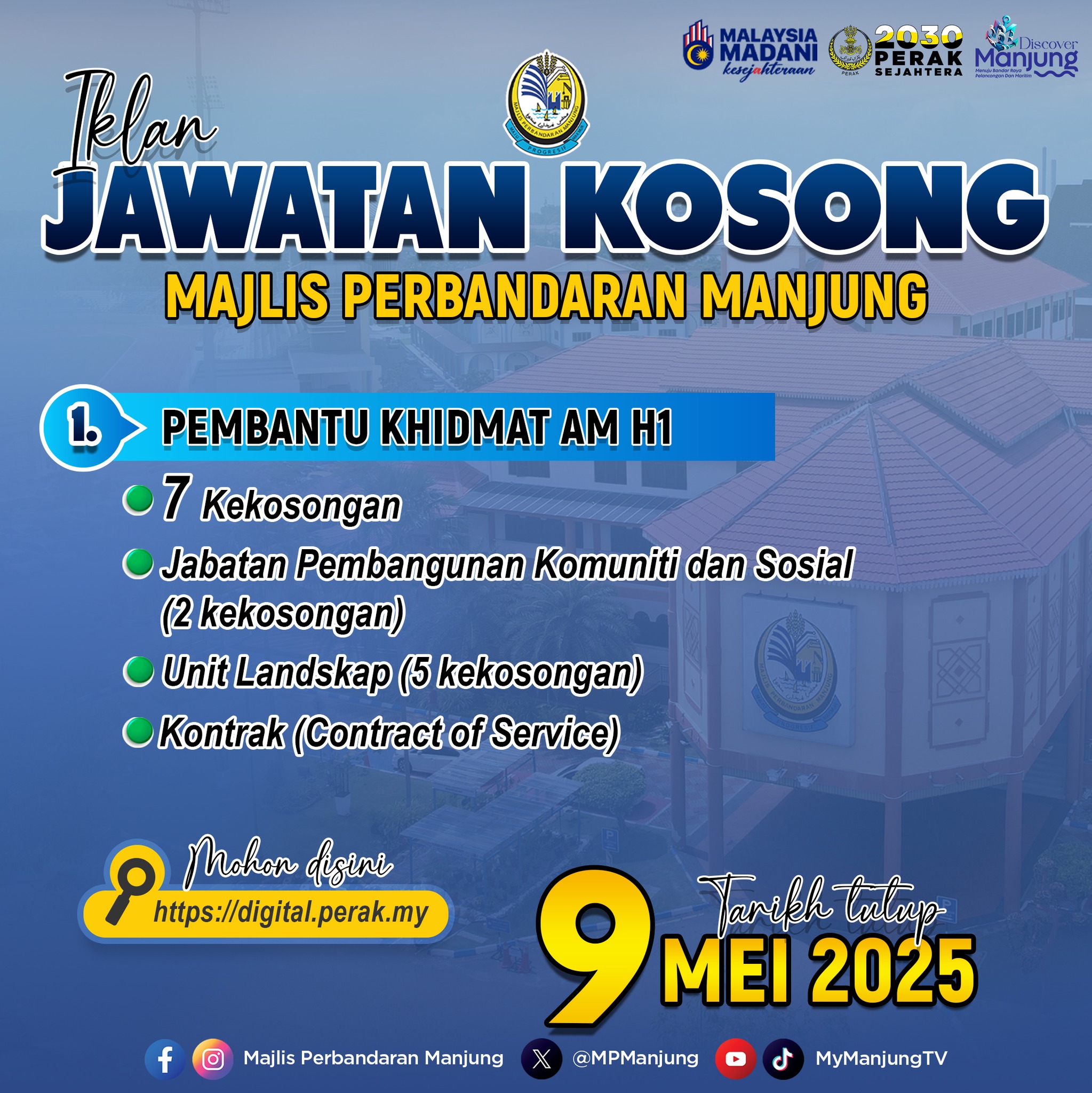 Terkini Iklan Jawatan Kosong Majlis Perbandaran Manjung (MPM) Klik Iklan Disini Like serta Ikut Facebook Kami, follow Chanel WhatsApp Jawatan Kosong & Telegram Portal SPA9 untuk capaian pantas kekosongan jawatan daripada kami sekarang.