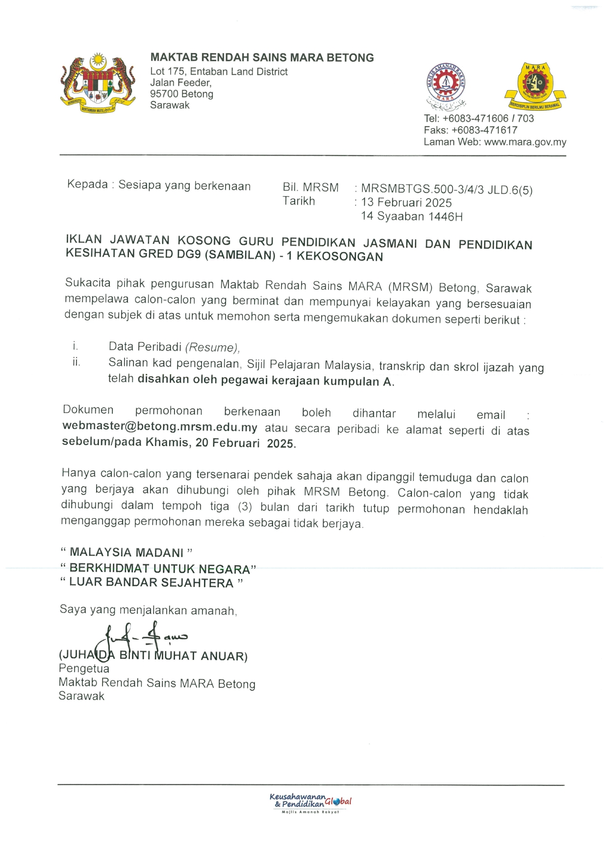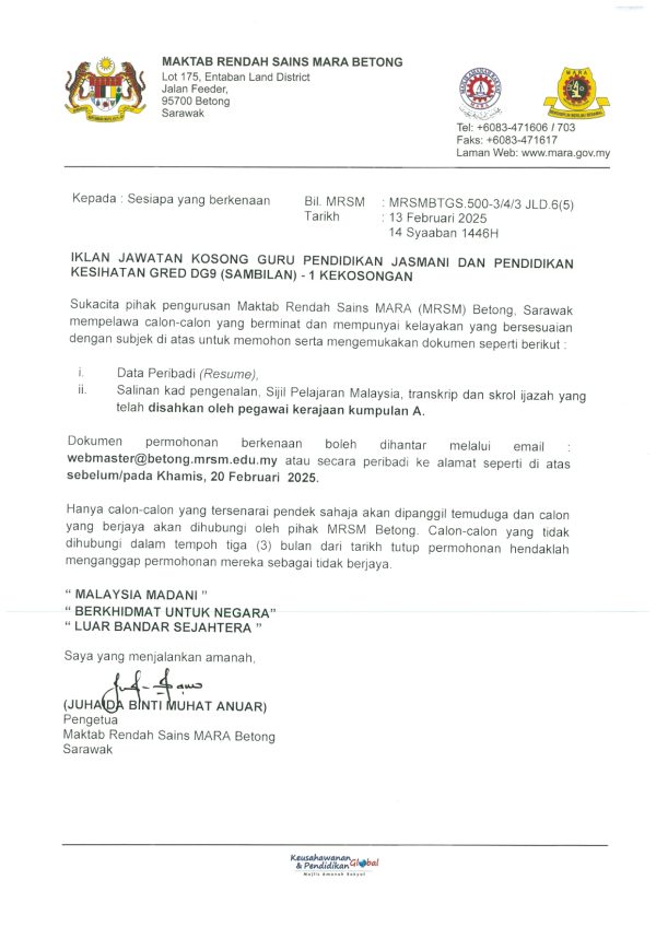 Terkini Iklan Jawatan Kosong Maktab Rendah Sains MARA (MRSM) Betong Klik Jawatan Disini Like serta Ikut Facebook Kami, follow Chanel WhatsApp Jawatan Kosong & Telegram Portal SPA9 untuk capaian pantas kekosongan jawatan daripada kami sekarang.