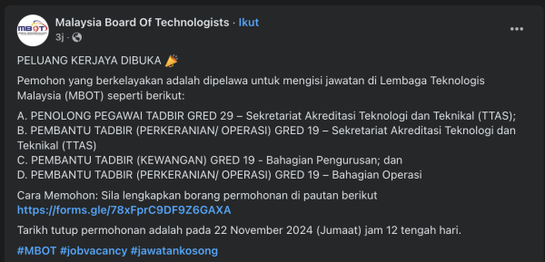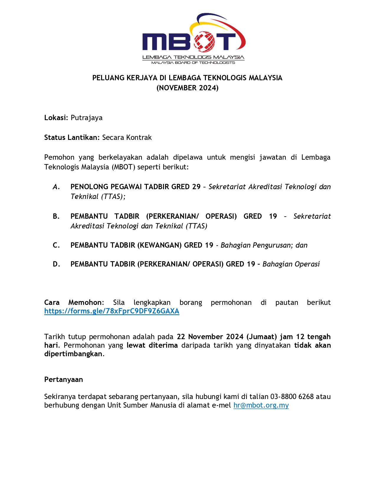 Terkini Iklan Lembaga Teknologis Malaysia (MBOT) Like serta Ikut Facebook Kami, follow Chanel WhatsApp Jawatan Kosong & Telegram Portal SPA9 untuk capaian pantas kekosongan jawatan daripada kami sekarang. Klik Iklan Jawatan