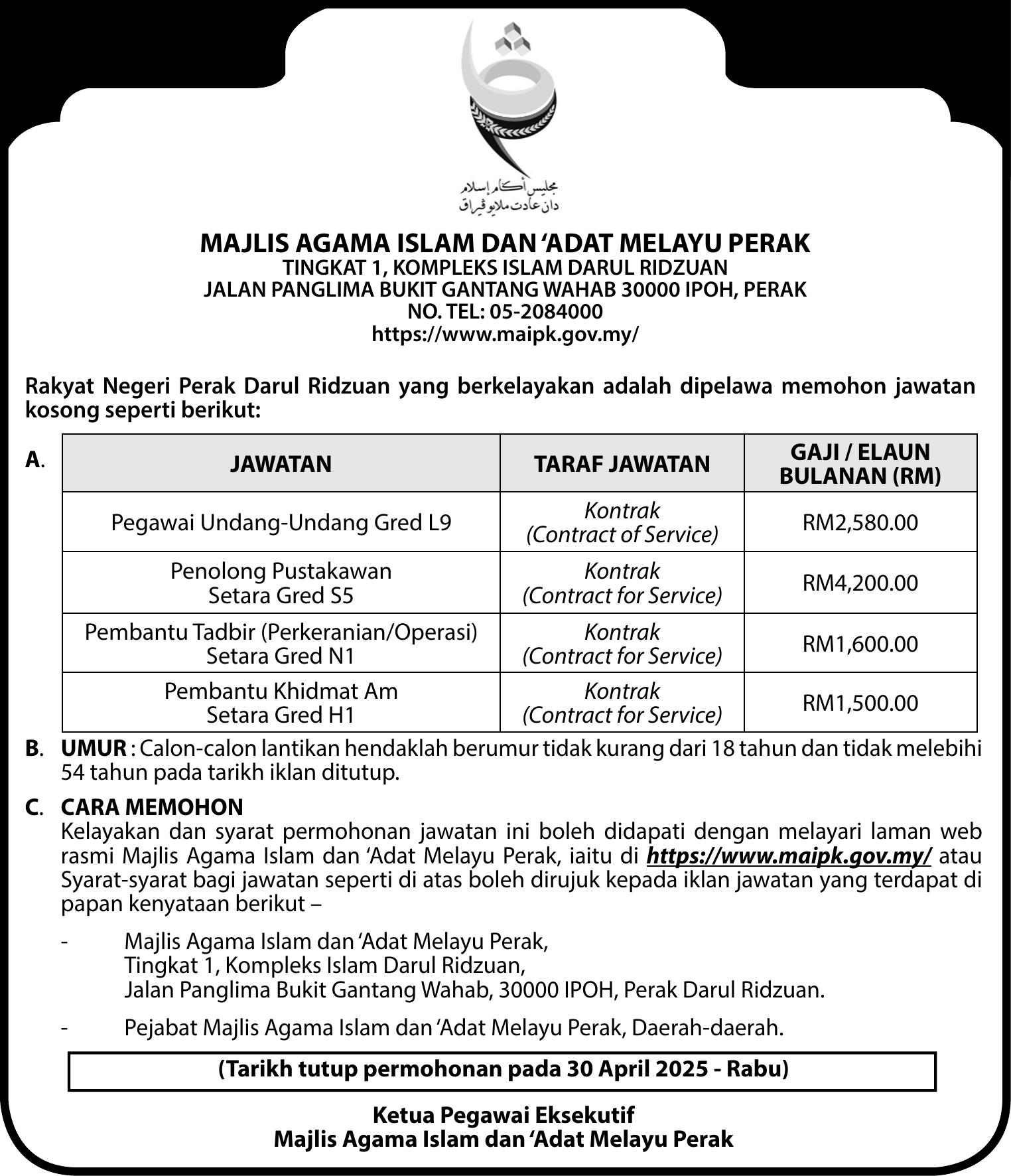 Terkini Jawatan Kosong Majlis Agama Islam dan ‘Adat Melayu Perak (MAIAMP) c1603007a.pdf Like serta Ikut Facebook Kami, follow Chanel WhatsApp Jawatan Kosong & Telegram Portal SPA9 untuk capaian pantas kekosongan jawatan daripada kami sekarang.