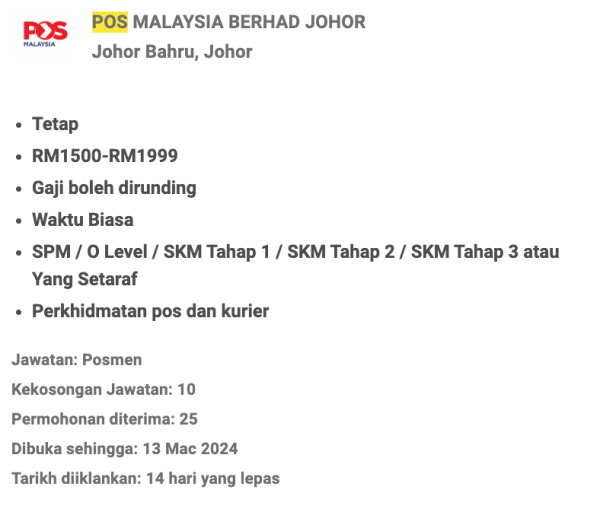 Permohonan jawatan ini boleh dibuat melalui Portal MyFutureJobs. Sila ke Portal MyFutureJobs dan Masukkan Kata Carian yang ingin dicari “POS MALAYSIA BERHAD JOHOR” di bahagian carian untuk memohon jawatan yang diiklankan.