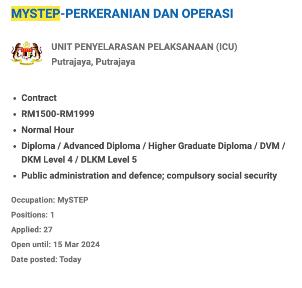 Permohonan jawatan ini boleh dibuat melalui Portal MyFutureJobs. Sila ke Portal MyFutureJobs dan Masukkan Kata Carian yang ingin dicari “UNIT PENYELARASAN PELAKSANAAN (ICU)” di bahagian carian untuk memohon jawatan yang diiklankan.